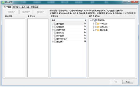 在二級菜單上點擊【用戶管理】按鈕,彈出用戶管理界面??删庉嫴块T、角色、用戶、角色權限和用戶權限。采用樹形結構的管理方式,部門可任意建立(無限級),部門可以設置權限,人員隨便添加到各部門中,人員可以繼承部門的權限,權限可以自定義,滿足各種復雜情況下的權限管理,在固有權限中有人員控制設備的擴展功能,不同的人員可以配置控制不同的設備。