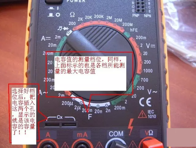 2、將功能旋轉(zhuǎn)開關(guān)打至電容(C)測(cè)量檔,并選擇合適的量程。
